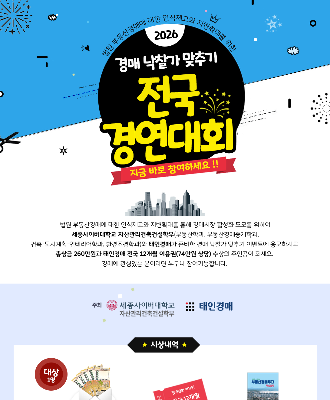 º» À̺¥Æ®´Â ¼¼Á¾»çÀ̹ö´ëÇб³ ÀÚ»ê°ü¸®°ÇÃà°Ç¼³ÇкΠ(ºÎµ¿»ê°æ¸ÅÁß°³Çаú,ºÎµ¿»êÀÚ»ê°æ¿µÇаú, °ÇÃࡤµµ½Ã°èȹÇаú, ȯ°æÁ¶°æÇаú)¿Í ÅÂÀΰæ¸Å¿¡¼ ÁøÇàÇÏ¸ç °æÇ° ¹ß¼ÛÀ» À§Çؼ¸¸ °³ÀÎÁ¤º¸ ¼öÁýÀ» ÇÕ´Ï´Ù.